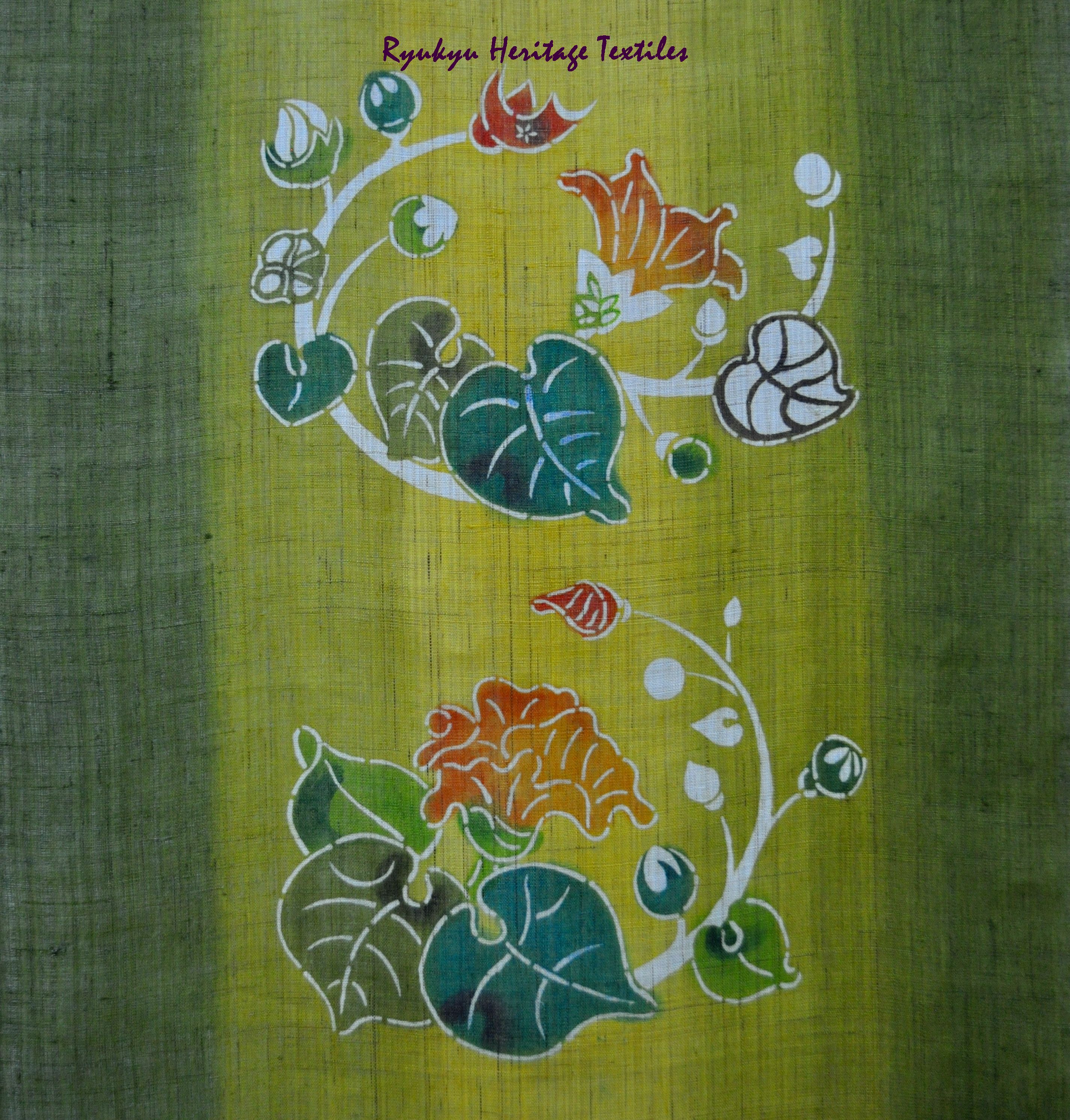 Sugarcane dye yields a beautiful green and yellow color…i like combining Ryukyu natural dye methods with the Bingata resist dye method…