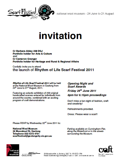 Oh happy day! One of my handwoven silk scarves will be on display in the “Rhythm of Life” exhibit at the National Wool Museum in Geelong, Australia, June 24-August 21, 2011. You’re welcome to attend the launch on Friday, June 24…oh, and don’t forget to wear a scarf!