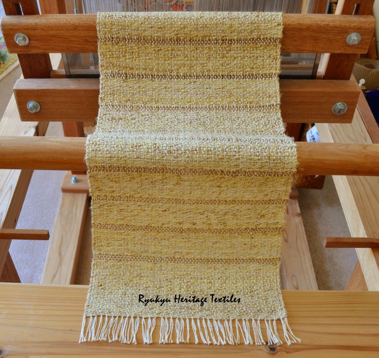 Guess what’s hanging on my Okinawan High Loom tom-tom (loom beater) today? A Japanese linen and hemp table runner…let’s keep smiling and weaving, OK?